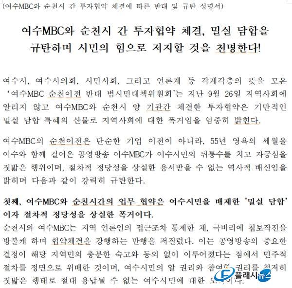ÇÑÆí ¿©¼öMBC ¼øÃµÀÌÀü ¹Ý´ë ¹ü½Ã¹Î´ëÃ¥À§¿øÈ¸(ÀÌÇÏ ´ëÃ¥À§)´Â ¿©¼öMBC¿Í ¼øÃµ½Ã °£ ü°áÇÑ ÅõÀÚÇù¾à°ú °ü·ÃÇØ ±ä±Þ ¼º¸í¼¸¦ ³»°í ¡°±â¸¸ÀûÀÎ ¹Ð½Ç ´ãÇÕ Æ¯ÇýÀÇ »ê¹°·Î Áö¿ª»çȸ¿¡ ´ëÇÑ Æø°Å¡±¶ó¸ç °·Â ±ÔźÇß´Ù.