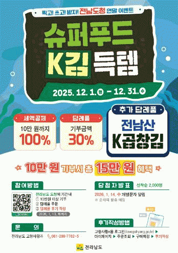 31ÀϱîÁö Àü³²µµÃ»¿¡ 10¸¸ ¿ø ÀÌ»ó ±âºÎÇÏ°í ´ä·Êǰ Èı⸦ ÀÛ¼ºÇÑ ¼±Âø¼ø 2õ ¸í¿¡°Ô Àü³² °öâ±èÀ» Ãß°¡·Î ÁõÁ¤ÇÑ´Ù.