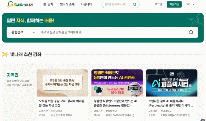 ¡®ºû³ª·¡¡¯´Â ¡®ºû°íÀ» ¹è¿ò³ª·¡¡¯ÀÇ ÁÙÀÓ¸»·Î, ±¤ÁÖ ½Ã¹ÎÀ̶ó¸é ´©±¸³ª ¿Â¶óÀÎ °Á¸¦ ¹«·á·Î ¼ö°ÇÒ ¼ö ÀÖ´Â °ø°øÇü ÇнÀ Ç÷§ÆûÀÌ´Ù. Áö¿ª¹ÎÀÇ Æò»ýÇнÀ Á¢±Ù¼ºÀ» ³ôÀ̰í, Áö¿ª »çȸÀÇ ±³À° °ÝÂ÷¸¦ ÇØ¼ÒÇϱâ À§ÇØ ±¸ÃàµÆ´Ù.