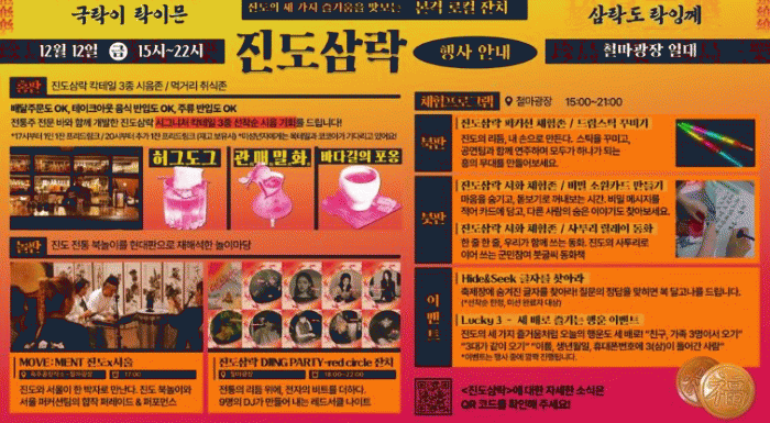 À̹ø Çà»ç´Â ÁøµµÀÇ ¼¼ °¡Áö Áñ°Å¿ò(»ï¶ô)ÀÎ ºÏ(ÍÕ), ÇÊ(ù¶), È«(ûõ)À» ÁÖÁ¦·Î ÁøµµÀÇ ÀüÅ빮ȸ¦ Çö´ëÀûÀ¸·Î Ç®¾î³»¸ç ¸ðµÎ°¡ ÇÔ²² Áñ±â´Â üÇèÇü ÃàÁ¦·Î ±âȹÇß°í, ÇàÁ¤¾ÈÀüºÎÀÇ ¡®»ýȰ±Ç ´ÜÀ§ ·ÎÄú귣µù Ȱ¼ºÈ »ç¾÷¡¯ÀÇ Çϳª·Î ÃßÁøµÈ´Ù.