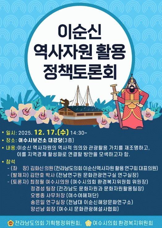 À̹ø Åä·Ðȸ´Â ÃÖÁ¤ÇÊ ¿©¼ö½ÃÀÇȸ ȯ°æº¹ÁöÀ§¿øÀå°ú ±èȽŠÀü³²µµÀÇȸ À̼ø½Å¿ª»çÀÚ¿ø Ȱ¿ë ¿¬±¸È¸ ´ëÇ¥ÀÇ¿øÀÌ °øµ¿ ÁÖ°üÇÑ´Ù.