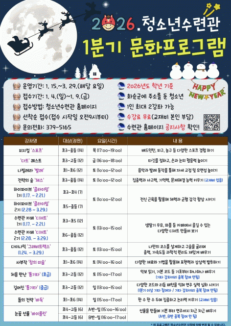 1ºÐ±â ÇÁ·Î±×·¥Àº 1¿ù 15ÀϺÎÅÍ 3¿ù 29ÀϱîÁö ¿î¿µµÇ¸ç, ȼø±º¿¡ ÁÖ¼Ò¸¦ µÐ û¼Ò³âÀº ´©±¸³ª Âü¿©ÇÒ ¼ö ÀÖ´Ù.