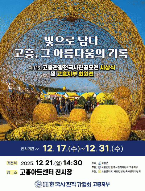 ÇÑÆí, Á¦11ȸ °íÈï°ü±¤ Àü±¹ »çÁø °ø¸ðÀü ½Ã»ó½ÄÀº ¿À´Â 12¿ù 21ÀÏ ¿ÀÈÄ 2½Ã 30ºÐ, °íÈï¾ÆÆ®¼¾ÅÍ 1Ãþ Àü½Ã½Ç¿¡¼ °³ÃÖµÉ ¿¹Á¤ÀÌ´Ù.