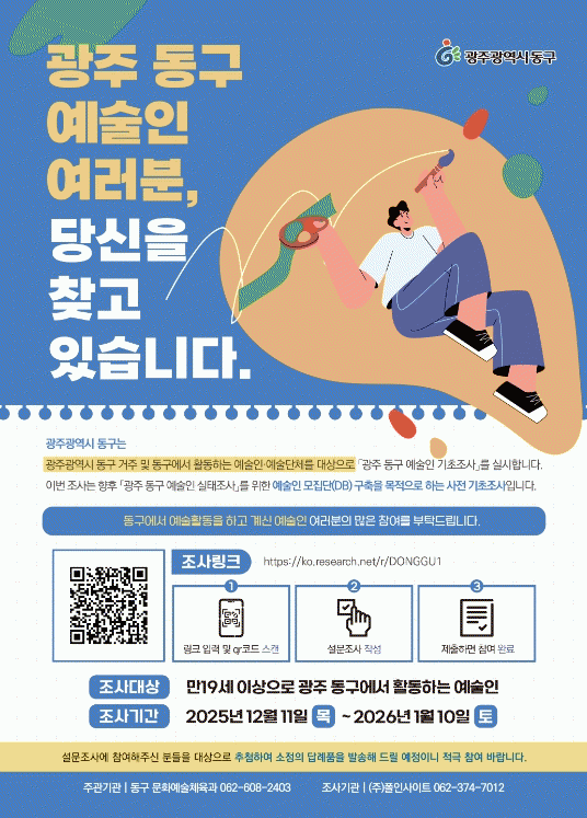 Áö³ 11ÀÏ ½ÃÀÛÇÑ À̹ø Á¶»ç´Â ÇâÈÄ ÃßÁøÇÒ ¡®±¤ÁÖ µ¿±¸ ¿¹¼úÀÎ ½ÇÅÂÁ¶»ç¡¯¸¦ À§ÇÑ ¿¹¼úÀÎ ¸ðÁý´ÜÀ» ±¸ÃàÇϱâ À§ÇÑ »çÀü ±âÃÊÁ¶»ç·Î, µ¿±¸ ¿¹¼úÀÎ Àüü¸¦ ´ë»óÀ¸·Î ±âº» ÇöȲÀ» ÆÄ¾ÇÇÏ´Â µ¥ ¸ñÀûÀÌ ÀÖ´Ù.