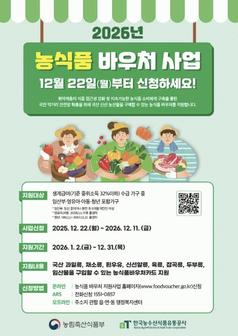 °Áø±º °ü°èÀÚ´Â ¡°³ó½Äǰ¹Ù¿ìó´Â ´Ü¼øÇÑ ½Äǰ Áö¿øÀ» ³Ñ¾î Ãë¾à°èÃþÀÇ °Ç°ÇÑ ½Ä»ýȰÀ» Áö¿øÇÏ´Â Áß¿äÇÑ Á¦µµ¡±¶ó¸ç ¡°2026³â¿¡´Â û³âÀ» Æ÷ÇÔÇÑ °¡±¸±îÁö Áö¿ø ´ë»óÀÌ È®´ëµÇ´Â ¸¸Å, ´ë»ó °¡±¸¿¡¼´Â ½Åû ±â°£À» ³õÄ¡Áö ¸»°í Àû±Ø ½ÅûÇÏ±æ ¹Ù¶õ´Ù¡±°í ¸»Çß´Ù.