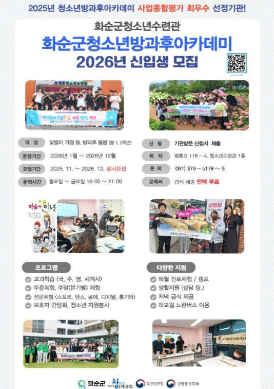2026³â ¹æ°úÈľÆÄ«µ¥¹Ì¿¡ Âü¿©Çϴ û¼Ò³âµéÀº ¡ã±¹¾î¡¤¼öÇС¤¿µ¾î µî ÇнÀ Áö¿ø ¡ã½ºÆ÷Ã÷, °ø¿¹, ³Å¸ ¹®È ¿¹¼ú üÇè ¡ãÁø·Î üÇè, ÁÖ¸» üÇè, Ä·ÇÁ ¡ã½É¸® »ó´ã ¹× Á¤¼ Áö¿ø ¡ã¼®½Ä Á¦°ø ¹× ¾ÈÀüÇÑ ±Í°¡ Â÷·® Áö¿ø µî ´Ù¾çÇÑ ¹æ°ú ÈÄ Á¾ÇÕ ¼ºñ½º¸¦ ¹«·á·Î ÀÌ¿ëÇÑ´Ù.