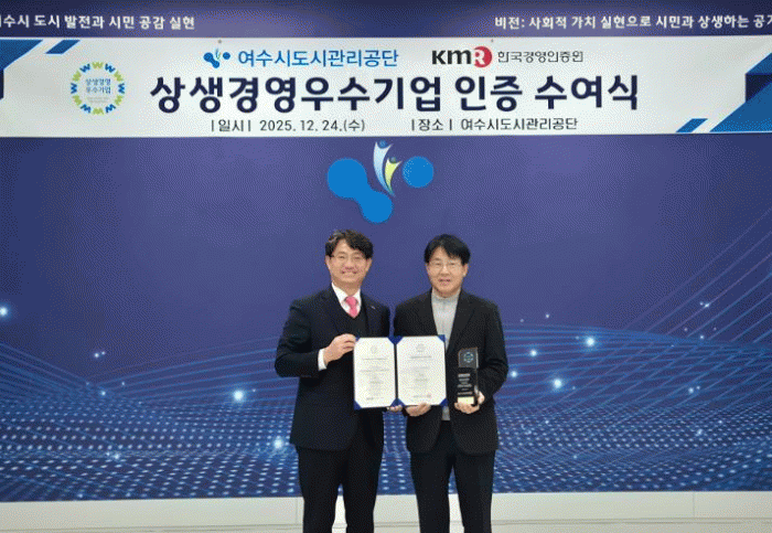 ¿©¼ö½Ãµµ½Ã°ü¸®°ø´Ü ÀÌ»çÀåÀº ¡°À̹ø »ó»ý°æ¿µ ¿ì¼ö±â¾÷ ÀçÀÎÁõÀº °ø´ÜÀÌ ÃßÁøÇؿ Áö¿ª»çȸ »ó»ý ³ë·Â°ú ESG °æ¿µ ½ÇõÀÌ ´Ù½Ã ÇÑ ¹ø ÀÎÁ¤¹ÞÀº °á°ú¡±¶ó¸ç, ¡°¾ÕÀ¸·Îµµ Áö¼Ó °¡´ÉÇÑ »ó»ý°æ¿µÀ» ½ÇÃµÇØ ½Ã¹ÎÀÌ Ã¼°¨ÇÒ ¼ö ÀÖ´Â »çȸÀû °¡Ä¡¸¦ âÃâÇØ ³ª°¡°Ú´Ù¡±°í ¸»Çß´Ù.