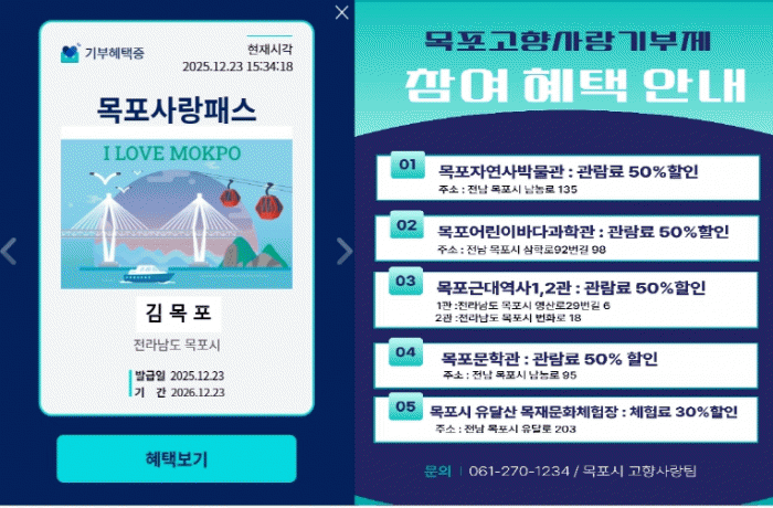 ÇÑÆí, ¸ñÆ÷½Ã´Â 2026³â 1¿ù 25ÀϱîÁö ¸ñÆ÷½Ã 7°³ ÁöÁ¤±âºÎ »ç¾÷¿¡ 10¸¸ ¿ø ÀÌ»ó ±âºÎÇÑ Âü¿©ÀÚ¸¦ ´ë»óÀ¸·Î ³×À̹öÆäÀÌ ÃÖ´ë 10¸¸ ¿ø »ó´çÀÇ »óǰ±ÇÀ» ÁõÁ¤ÇÏ´Â ¡®½Å³â À̺¥Æ®¡¯¸¦ ÁøÇàÇϸç, °íÇâ»ç¶û±âºÎÁ¦ Âü¿© Ȱ¼ºÈ¿¡ ³ª¼³ °èȹÀÌ´Ù.