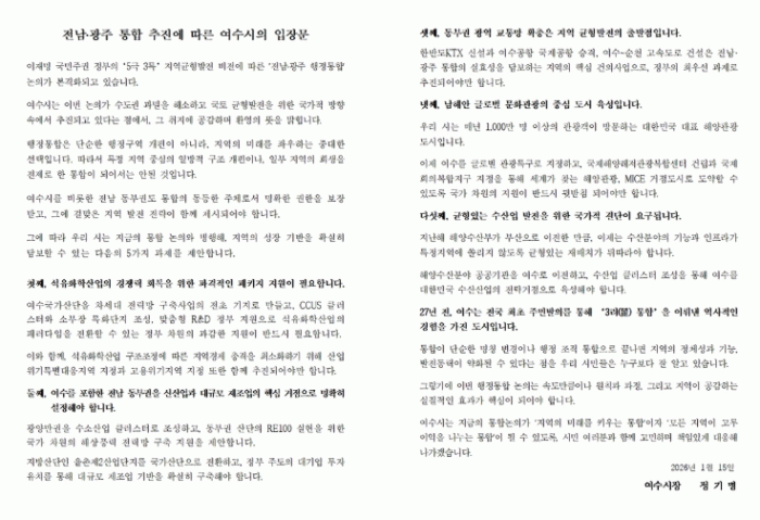 Á¤±â¸í ¿©¼ö½ÃÀåÀº ¡°¿©¼ö´Â °ú°Å Àü±¹ ÃÖÃÊ·Î ÁֹιßÀǸ¦ ÅëÇÑ ¡®3·Á ÅëÇÕ¡¯À» ÀÌ·ï³½ ÀÚÄ¡ ºÐ±ÇÀÇ »ó¡Àû µµ½Ã¡±¶ó¸ç ¡°À̹ø ÇàÁ¤ÅëÇÕÀÌ ¿©¼öÀÇ Á¤Ã¼¼ºÀ» ÁöŰ¸é¼µµ »õ·Î¿î µµ¾àÀÇ ±âȸ°¡ µÉ ¼ö ÀÖµµ·Ï ½Ã¹Îµé°ú ÇÔ²² Ä¡¹ÐÇÏ°Ô ´ëÀÀÇØ ³ª°¡°Ú´Ù¡±¶ó°í ¹àÇû´Ù.