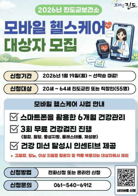 ¸ðÁý ´ë»óÀº 20¼¼ºÎÅÍ 64¼¼±îÁöÀÇ Áøµµ±º °ÅÁÖÀÚ ¶Ç´Â Áøµµ±º ¼ÒÀç Á÷ÀåÀÎ Áß °Ç° À§Çè¿äÀÎ(Ç÷¾Ð, Ç÷´ç, Áß¼ºÁö¹æ, ÄÝ·¹½ºÅ×·Ñ)À» º¸À¯Çϰí ÀÖ´Â ´ë»óÀÚ¸¦ ¿ì¼± ¼±Á¤ÇÑ´Ù.