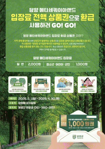 °ü±¤°´Àº ¸ÞŸ¼¼ÄõÀÌ¾Æ °¡·Î¼ö±æ ÀÔÀå ½Ã ³³ºÎÇÑ ÀÔÀå·á Àü¾×À» »óǰ±ÇÀ¸·Î ȯ±Þ¹Þ°Ô µÈ´Ù. ÀÔÀå·á´Â ¾î¸¥ 2,000¿ø, û¼Ò³â¡¤¾î¸°ÀÌ¡¤±ºÀÎ 1,000¿øÀ̸ç, ȯ±Þ¹ÞÀº »óǰ±ÇÀº ¸ÞŸ·£µå ³» »ó°¡¿Í ´ã¾çÀ¾ Áß¾Ó·Î ÀÏ´ë »ó°¡¿¡¼ ¿ì¼± »ç¿ëÇÒ ¼ö ÀÖ´Ù.