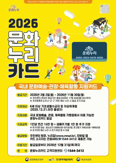 ¹®È´©¸®Ä«µå´Â ¹®È¿¹¼ú¡¤±¹³»¿©ÇࡤüÀ°È°µ¿ ÀÌ¿ëÀ» Áö¿øÇÏ´Â Á¦µµ·Î, 2026³â¿¡´Â Áö³ÇØ ´ëºñ 1¸¸ ¿ø ÀλóµÈ ¿¬°£ 15¸¸ ¿øÀÌ Áö¿øµÈ´Ù.