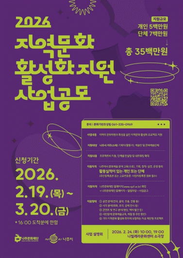 ³ªÁÖ¹®ÈÀç´ÜÀº ¡®2026 Áö¿ª¹®È Ȱ¼ºÈ Áö¿ø»ç¾÷¡¯ °ø¸ð¸¦ ¿À´Â 3¿ù 20ÀÏ ¿ÀÈÄ 4½Ã±îÁö ÁøÇàÇÑ´Ù°í 19ÀÏ ¹àÇû´Ù.
