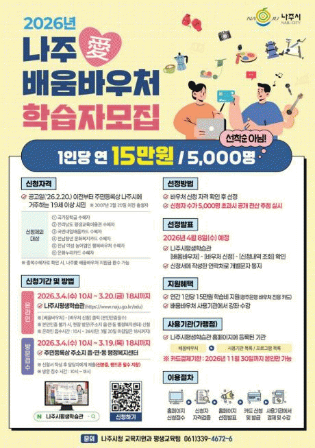 ³ªÁֽô 19¼¼ ÀÌ»ó ½Ã¹ÎÀ» ´ë»óÀ¸·Î ¿¬°£ 15¸¸ ¿øÀ» ¹Ù¿ìó Àü¿ë Ä«µå·Î Áö¿øÇÏ´Â ¡®³ªÁÖ¾Ö¹è¿ò¹Ù¿ìó¡¯ ÇнÀÀÚ ½ÅûÀ» 3¿ù 4ÀϺÎÅÍ 20ÀϱîÁö Á¢¼öÇÑ´Ù°í 23ÀÏ ¹àÇû´Ù.