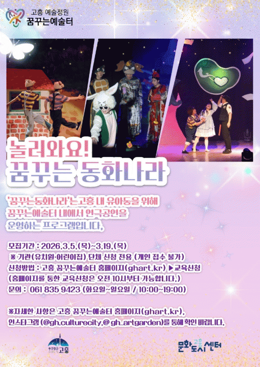 À̹ø °ø¿¬Àº °íÈï ²Þ²Ù´Â¿¹¼úÅÍ 2Ãþ ¸öÀÛ¾÷Àå¿¡¼ 4¿ùºÎÅÍ 6¿ù±îÁö ÃÑ 3ȸ¿¡ °ÉÃÄ ÁøÇàµÈ´Ù. Ã¥ ¼Ó¿¡¼¸¸ ¸¸³µ´ø µ¿È ¼Ó ÁÖÀΰøµéÀÌ ¹«´ë À§¿¡¼ »ý»ýÇÏ°Ô ÆîÃÄÁö´Â ¿¬ÃâÀ» ÅëÇØ, ¾î¸°À̵鿡°Ô ´Ü¼øÇÑ °ü¶÷À» ³Ñ¾î¼± Ưº°ÇÑ ¹®È¿¹¼ú üÇèÀ» ¼±»çÇÒ ¿¹Á¤ÀÌ´Ù.