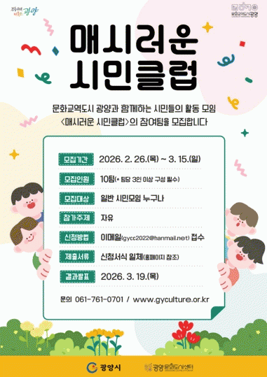 '¸Å½Ã·¯¿î ½Ã¹ÎŬ·´' 7±â ½ÅûÀº 3¿ù 15ÀÏ ÀÚÁ¤±îÁö ÀüÀÚ¿ìÆíÀ¸·Î Á¢¼öÇÑ´Ù. ¼·ù ½É»ç¸¦ °ÅÃÄ 3¿ù 19ÀÏ ÃÖÁ¾ Âü°¡ÆÀÀ» ¹ßÇ¥ÇÒ ¿¹Á¤ÀÌ´Ù. ½Åû ¼½ÄÀº ±¤¾ç¹®Èµµ½Ã¼¾ÅÍ ´©¸®Áý¿¡¼ ³»·Á¹ÞÀ» ¼ö ÀÖ´Ù. ÀÚ¼¼ÇÑ »çÇ×Àº ±¤¾ç¹®Èµµ½Ã¼¾ÅÍ·Î ¹®ÀÇÇÏ¸é µÈ´Ù.