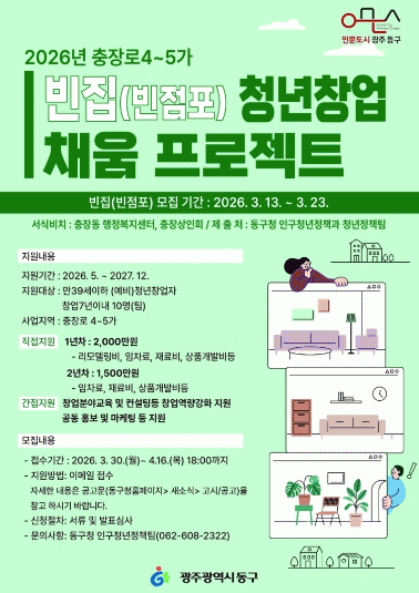 µ¿±¸´Â ÀÌ·¯ÇÑ Á¤Ã¥ÀÇ ÀÏȯÀ¸·Î ÃæÀå·Î 4¡¤5°¡ ÀÏ´ë ºó Á¡Æ÷¸¦ Ȱ¿ëÇÑ ¡®2026³â ºóÁý û³ââ¾÷ ä¿ò ÇÁ·ÎÁ§Æ®¡¯¸¦ º»°Ý ÃßÁøÇÑ´Ù. À̹ø »ç¾÷Àº À¯ÈÞ Á¡Æ÷¸¦ û³â â¾÷°ø°£À¸·Î Àç»ýÇØ Áö¿ª »ó±Ç¿¡ Ȱ·ÂÀ» ºÒ¾î³Ö°í, û³âµé¿¡°Ô´Â ¾ÈÁ¤ÀûÀΠâ¾÷ ±â¹ÝÀ» Á¦°øÇÏ´Â °ÍÀ» ¸ñÇ¥·Î ÇÑ´Ù.