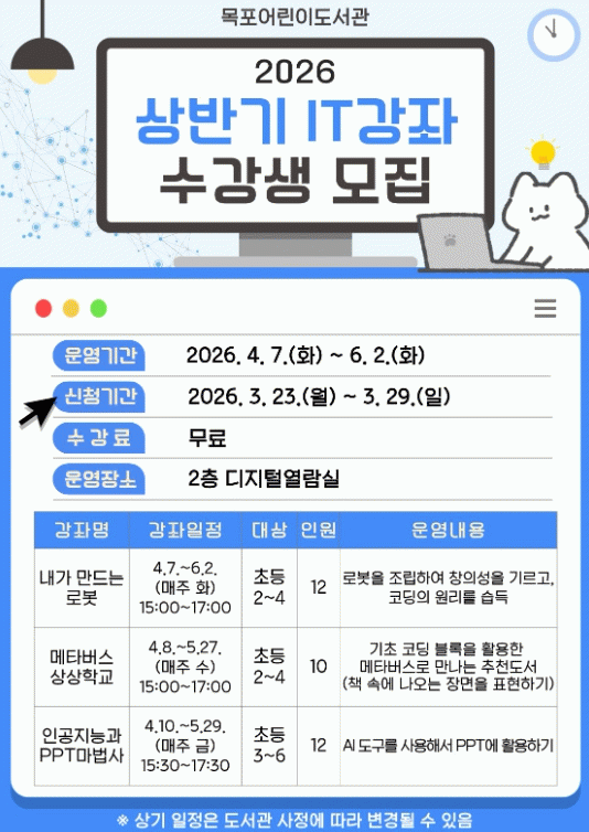 À̹ø °Á´ ¡ã³»°¡ ¸¸µå´Â ·Îº¿(Ãʵî 2~4Çгâ) ¡ã¸ÞŸ¹ö½º »ó»óÇб³(Ãʵî 2~4Çгâ) ¡ãÀΰøÁö´É°ú PPT ¸¶¹ý»ç(Ãʵî 3~6Çгâ) µî ÃÑ 3°³ °úÁ¤À¸·Î, °¢ 8ȸÂ÷·Î ÁøÇàµÈ´Ù.