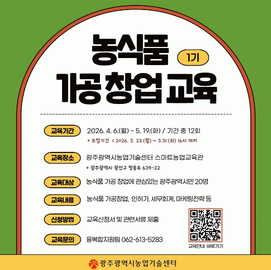 Á¢¼ö±â°£Àº 1±â 3¿ù 23ÀϺÎÅÍ 31ÀϱîÁö, 2±â 7¿ù 6ÀϺÎÅÍ 14ÀϱîÁöÀÌ´Ù. ½Äǰ°¡°ø ¹× â¾÷¿¡ °ü½É ÀÖ´Â ±¤ÁֽùÎÀÌ¸é ½ÅûÇÒ ¼ö ÀÖÀ¸¸ç, ¼·ù ½É»ç¸¦ ÅëÇØ ±³À°»ýÀ» ¼±¹ßÇÑ´Ù. ½ÅûÀº ±¤ÁÖ±¤¿ª½Ã³ó¾÷±â¼ú¼¾ÅÍ ´©¸®Áý(±³À°¸¶´ç-±³À°¾È³»)¿¡¼ È®ÀÎÇÒ ¼ö ÀÖ´Ù.