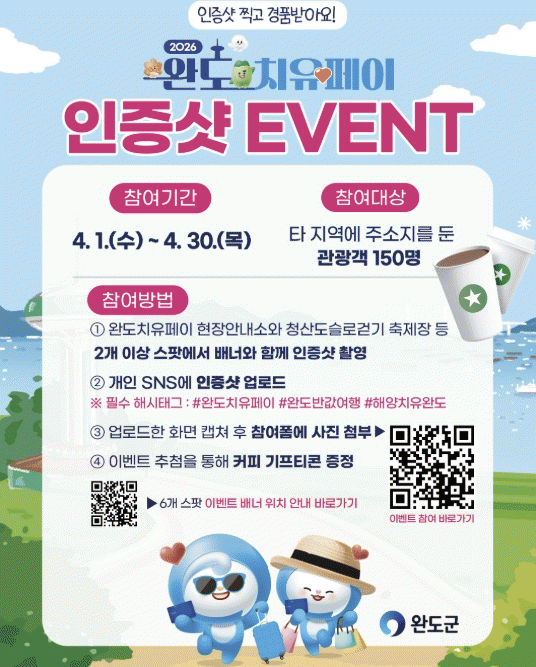 À̺¥Æ® ¹è³Ê´Â ¿ÏµµÄ¡À¯ÆäÀÌ ÇöÀå ¾È³»¼Ò(¿ÏµµÀ¾ ÇØº¯°ø¿ø·Î84)¿Í û»êµµÀÇ µµÃ»Ç× º¹Áöȸ°ü ¾Õ ¸ÞÀÎ ºÎ½º, º½ÀÇ ¿ÐÃ÷ ¼¼Æ®Àå(¼ÆíÁ¦±æ), µµ¶ô¸® ¸¶À» ÀåÅÍ, Áø»ê¸® ¸¶À» ÀåÅÍ, û»êµµ ÇØ¾çÄ¡À¯°ø¿ø µîÀÌ´Ù.