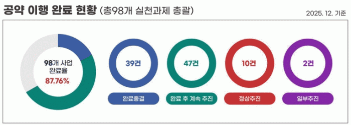 2025³â 12¿ù ¸» ±âÁØ ³ªÁֽô ÃÑ 98°³ °ø¾à »ç¾÷ Áß 86°³¸¦ ¿Ï·áÇϰųª ÀÌÇà ÈÄ ÃßÁøÇØ 87.76%ÀÇ ÀÌÇà·üÀ» ±â·ÏÇßÀ¸¸ç ÀÌ´Â Àü±¹ Æò±Õ 70.42%º¸´Ù 17.34%p, Àü³² Æò±Õ 68.27%º¸´Ùµµ Å©°Ô ³ôÀº ¼öÄ¡´Ù.