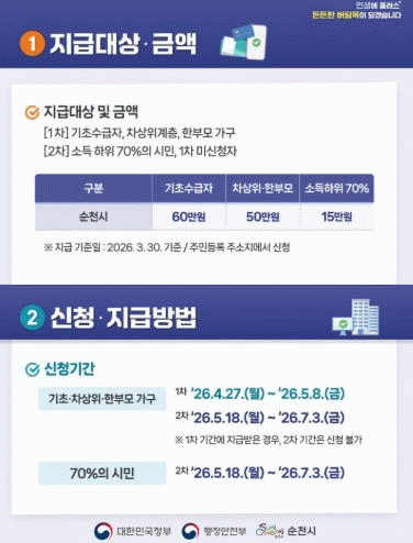 Áö±Þ ´ë»óÀº ¿ÃÇØ 3¿ù 30ÀÏ ±âÁØÀ¸·Î ¼øÃµ½Ã¿¡ Áֹεî·ÏÀÌ µÇ¾î ÀÖ´Â ½Ã¹ÎÀ¸·Î, ¼ºÀÎ(2007³â 12¿ù 31ÀÏ ÀÌÀü Ãâ»ýÀÚ)Àº °³Àκ° ½ÅûÀÌ °¡´ÉÇÏ¸ç ¹Ì¼º³âÀÚ(2008³â 1¿ù 1ÀÏ ÀÌÈÄ Ãâ»ýÀÚ)´Â Áֹεî·Ï»ó ¼¼´ëÁÖ°¡ ½ÅûÇÒ ¼ö ÀÖ´Ù.