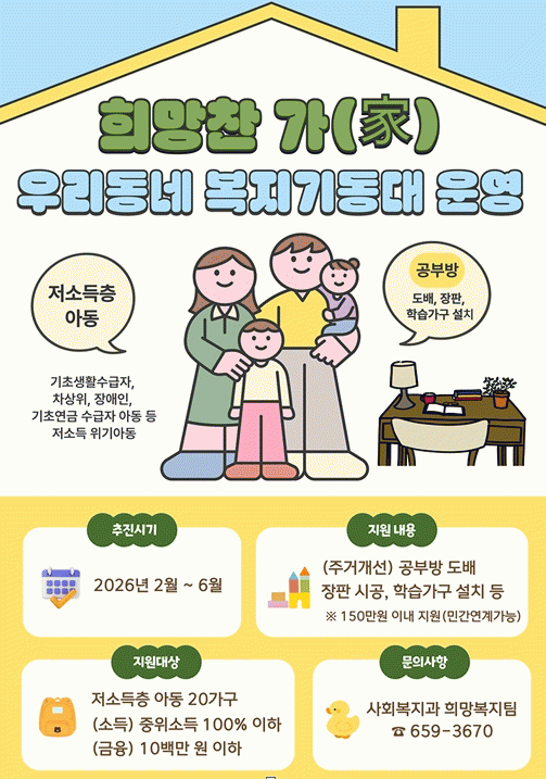 Áö¿ø ´ë»óÀº ±âÃÊ»ýȰ¼ö±ÞÀÚ, Â÷»óÀ§°èÃþ, Àå¾ÖÀÎ ¹× ¹ýÁ¤ ÇѺθ𠰡Á¤ µî Àú¼ÒµæÃþ ¾Æµ¿ 20¸íÀ¸·Î, ÇöÀå ¹æ¹®Á¶»ç¸¦ ÅëÇØ À§±â ¼öÁØÀÌ ³ôÀº ¾Æµ¿À» ¿ì¼± ¼±Á¤ÇÒ ¿¹Á¤ÀÌ´Ù.