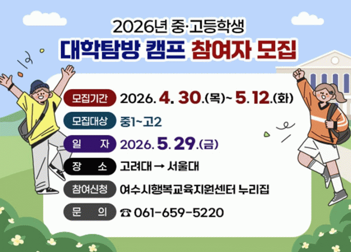 ¸ðÁý ÀοøÀº ÃÑ 55¸í(ÁßÇлý 30¸í, °íµîÇлý 25¸í)À̸ç, Âü¿©¸¦ Èñ¸ÁÇÏ´Â ÇлýÀº ¿©¼ö½ÃÇູ±³À°Áö¿ø¼¾ÅÍ ´©¸®Áý¿¡¼ ½ÅûÇÒ ¼ö ÀÖ´Ù.