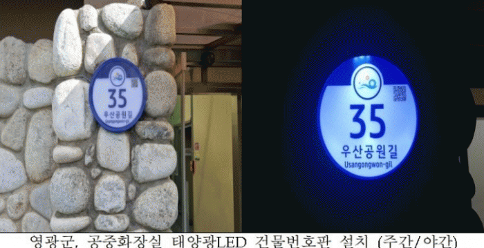 ¼³Ä¡ À§Ä¡´Â ¿µ±¤»ýȰüÀ°°ø¿ø, ºÒ°©»ç °ü±¤Áö, ¹é¼öÇØ¾Èµµ·Î ÀÏ¿ø µî °ü³» °ü±¤Áö ¹× °ø¿ø ³» °øÁßÈÀå½Ç·Î, ¼³Ä¡µÈ °Ç¹°¹øÈ£ÆÇÀº ÃÑ 49°³À̸ç ž籤LED Á¶¸íÀ» Àû¿ëÇÏ¿© ³·¿¡ ž籤À» ÀÌ¿ëÇØ Àü·ÂÀ» ÃæÀüÇÑ µÚ ¾ß°£¿¡ Á¡µîÇϴ ģȯ°æ ¹æ½ÄÀ¸·Î ¾îµÎ¿î ¹ã±æ¿¡µµ µµ·Î¸í°ú À§Ä¡ Á¤º¸¸¦ ½±°Ô È®ÀÎÇÒ ¼ö ÀÖ¾î ÀÌ¿ëÀÚÀÇ ½ÃÀμºÀ» ³ôÀÌ°í ½É¸®ÀûÀÎ ¾È½É È¿°ú¸¦ Á¦°øÇÑ´Ù.