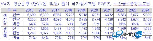 Àü³²Àº ³«ÁöÀÇ ÁÖ¿ä »ý»êÁö´Ù. 2024³â ³«Áö »ý»ê·®Àº 3,409ÅæÀ¸·Î, Àü±¹ »ý»ê·®(5,899Åæ)ÀÇ ¾à 58%¸¦ Â÷ÁöÇϰí ÀÖÁö¸¸, ÃÖ±Ù ÀÚ¿ø·®ÀÌ Áö¼ÓÇØ¼ ÁÙ¸é¼ ¾î¾÷ÀÎÀÇ ¾î·Á¿òµµ Ä¿Áö°í ÀÖ´Ù.