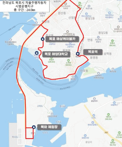¸ñÆ÷ ÀÚÀ²ÁÖÇàÂ÷ ½Ã¹ü¿îÇàÁö±¸´Â µµ½É¡¤°ü±¤¡¤Áö¿ª»ê¾÷À» ¿¬°èÇÑ ÀÚÀ²ÁÖÇà ¼ºñ½º ½ÇÁõ°ú »ó¿ëÈ ±â¹ÝÀ» À§ÇØ ¸ñÆ÷¿ªÀ» ½ÃÀÛÀ¸·Î ÇØ¾ç´ëÇб³, ÇØ»óÄÉÀ̺íÄ«, ¸ñÈüÇèÀå, »êÁ¤³ó°ø´ÜÁö¸¦ ¼øÈ¯ÇÏ´Â ÃÑ 24km ³ë¼±ÀÌ´Ù.