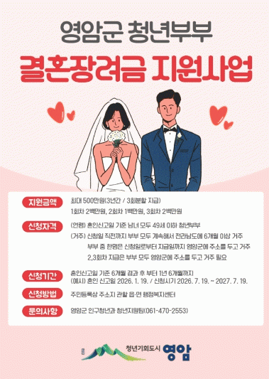 ¡®2026 û³âºÎºÎ °áÈ¥Àå·Á±Ý Áö¿ø»ç¾÷¡¯¿¡ µû¸¥ ÀÌ Áö¿øÀº, ½ÅÈ¥ºÎºÎ °æÁ¦ ºÎ´ã ¿ÏÈ, û³â Àα¸ À¯ÀÔ ¹× Áö¿ª Á¤ÂøÀ» À§ÇÑ °Í.