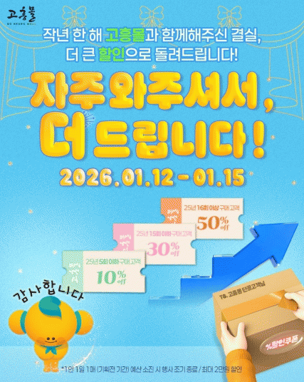 À̹ø ±âȹÀüÀº 2025³â ¿¬°£ ÃÖ´ë ¸ÅÃâ ´Þ¼ºÀ» ±â³äÇϰí, ±× ¼º°ú¿¡ ±â¿©ÇÑ ±¸¸Å °í°´¿¡°Ô °¨»çÀÇ ¶æÀ» ÀüÇϱâ À§ÇØ ¸¶·ÃµÆ´Ù. 2025³â ÇÑ ÇØ °íÈï¸ô ÁÖ¹® Ƚ¼ö¸¦ ±âÁØÀ¸·Î °í°´º° Â÷µî ÇÒÀÎ ÇýÅÃÀ» Á¦°øÇÏ´Â °ÍÀÌ Æ¯Â¡À¸·Î, °íÈï¸ôÀ» ²ÙÁØÈ÷ ÀÌ¿ëÇØ ¿Â ´Ü°ñ °í°´Àϼö·Ï ´õ Å« ÇýÅÃÀ» ¹ÞÀ» ¼ö ÀÖµµ·Ï ¼³°èµÈ °í°´ °¨»çÇü ÇÁ·Î¸ð¼ÇÀÌ´Ù.
