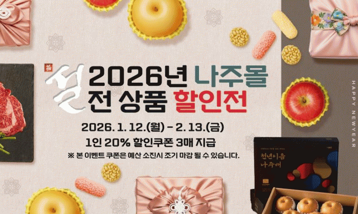 À̹ø ±âȹÀüÀº ³ªÁÖ¹è, ½Ò, ÇѶóºÀ, È«¾î, ÇÑ¿ì µî ³ªÁֽø¦ ´ëÇ¥ÇÏ´Â ¿ì¼ö ³óƯ»ê¹°À» ´ë»óÀ¸·Î Çϸç Çà»ç ±â°£¿¡ ³ªÁÖ¸ô¿¡¼ 5¸¸ ¿ø ÀÌ»ó ±¸¸Å ½Ã Àüǰ¸ñ 20% ÇÒÀÎ ÇýÅÃÀ» Á¦°øÇϰí ÇÒÀÎ ±Ý¾×Àº 1Àδç ÃÖ´ë 4¸¸ ¿ø±îÁö Àû¿ëµÈ´Ù.