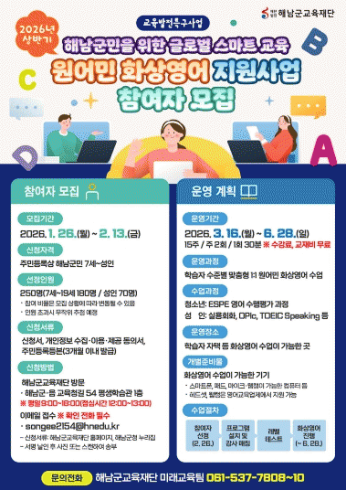¹Ý±âº° ±³À° ÀοøÀº 7¼¼~19¼¼ û¼Ò³â 180¸í°ú ¼ºÀÎ 70¸íÀ¸·Î ±¸¼ºµÈ´Ù. Âü¿©ÀÚµéÀº ÁÖ 2ȸ, °¢ 30ºÐ¾¿ 15ÁÖ µ¿¾È È»ó¿µ¾î ¼ö¾÷ÀÌ °¡´ÉÇÑ °÷¿¡¼ Æí¸®ÇÏ°Ô ±³À°À» ¹ÞÀ» ¼ö ÀÖ´Ù.