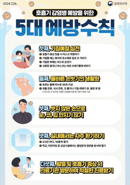 È£Èí±â °¨¿°º´ ¿¹¹æÀ» À§ÇÑ 5´ë ¼öÄ¢Àº ±âħ ¿¹Àý ½Çõ, ¿Ã¹Ù¸¥ ¼Õ ¾Ä±âÀÇ »ýȰÈ, ¾ÄÁö ¾ÊÀº ¼ÕÀ¸·Î ´«, ÄÚ, ÀÔ ¸¸ÁöÁö ¾Ê±â, ½Ç³»¿¡¼´Â ÀÚÁÖ È¯±âÇϱâ, ¹ß¿ ¹× È£Èí±â Áõ»ó ½Ã ÀÇ·á±â°ü ¹æ¹®ÇÏ¿© ÀûÀýÇÑ Áø·á ¹Þ±âÀÌ´Ù.