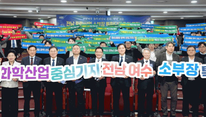 °³È¸½Ä¿¡¼± Àü³² ÈÇлê¾÷ÀÇ »õ·Î¿î ÀÌÁ¤Ç¥°¡ µÉ ƯȴÜÁö À¯Ä¡ ÀÇÁö¸¦ ´ãÀº ¡®ÁöÁ¤ ´çÀ§¼º È®»ê ÆÛÆ÷¸Õ½º¡¯°¡ ÆîÃÄÁ³´Ù. Âü¼®ÀÚµéÀº Àü³² ¿©¼ö°¡ ´ëÇѹα¹ ÈÇлê¾÷ÀÇ ½ÉÀåÀÌÀÚ °ø±Þ¸Á ¾Èº¸ÀÇ ÃÖÀûÁöÀÓÀ» õ¸íÇϸç, ¹Ýµå½Ã ÁöÁ¤À» À̲ø¾î³»°Ú´Ù´Â °·ÂÇÑ °áÀǸ¦ ´ÙÁö´Â ±â³äÃÔ¿µÀ¸·Î Æ÷·³ÀÇ ¹®À» ¿¾ú´Ù.