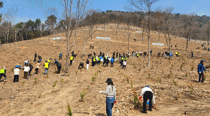 Âü¿©ÀÚµéÀº ¼Ò³ª¹«Àç¼±Ãæº´ ÇÇÇØÁöÀÎ ¹¦µµµ¿ ¼öÁ¾ÀüȯÁö 5ha¿¡ Æí¹é³ª¹« 4,000±×·ç¸¦ ½ÄÀçÇϸç ÈÑ¼ÕµÈ »ê¸²ÀÇ È¸º¹°ú °Ç°ÇÑ ½£ Á¶¼º¿¡ ÈûÀ» º¸ÅÉ´Ù.