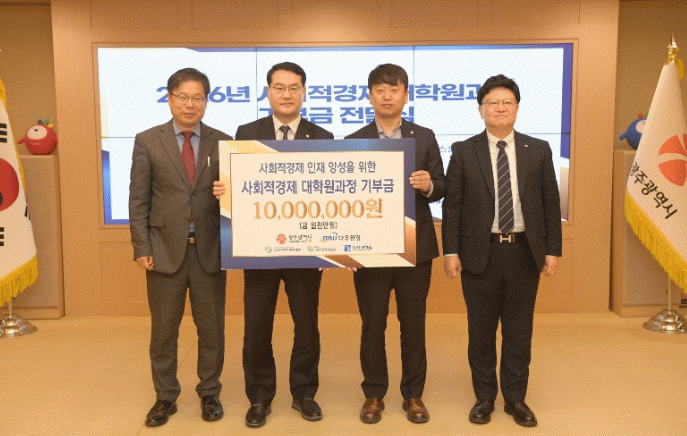 ±¤ÁÖ±¤¿ª½Ã´Â 27ÀÏ ½Ãû ºñÁî´Ï½º·ë¿¡¼ ¡®»çȸÀû°æÁ¦ ´ëÇпø°úÁ¤ Áö¿ø»ç¾÷ ±âºÎ±Ý Àü´Þ½Ä¡¯À» ¿¾î ´Ù¿ìȯ°æ ÀÌÁ¤ÀÏ ´ëÇ¥·ÎºÎÅÍ ±âºÎ±Ý 1000¸¸¿øÀ» Àü´Þ¹Þ¾Ò´Ù. Çà»ç¿¡´Â ±è¿µ¹® ¹®È°æÁ¦ºÎ½ÃÀå°ú ÀÌÁ¤ÀÏ ´ëÇ¥, ±èµµ°æ Á¶¼±´ëÇб³ ´ëÇпøÀå µîÀÌ Âü¼®Çß´Ù.