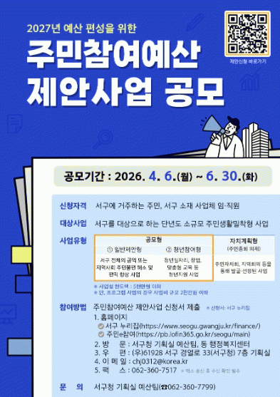 °ø¸ð´Â ¼±¸ Áֹΰú ¼±¸ ¼ÒÀç »ç¾÷ü ÀÓÁ÷¿øÀÌ Âü¿©ÇÒ ¼ö ÀÖ´Ù. Á¦¾ÈÀº ¼±¸ ´©¸®Áý(±¸Á¤»ì¸²-ÁÖ¹ÎÂü¿©¿¹»êÁ¦-Á¦¾È»ç¾÷½Åû)À» ÅëÇÑ ¿Â¶óÀÎ ½Åû°ú ¿ìÆí¡¤ÀüÀÚ¿ìÆí¡¤ÆÑ½º¡¤¹æ¹® Á¢¼ö µîÀ¸·Î °¡´ÉÇÏ´Ù. ÀÚ¼¼ÇÑ »çÇ×Àº ¼±¸Ã» ±âȹ½Ç ¿¹»êÆÀ(062-360-7799)À¸·Î ¹®ÀÇÇÏ¸é µÈ´Ù.