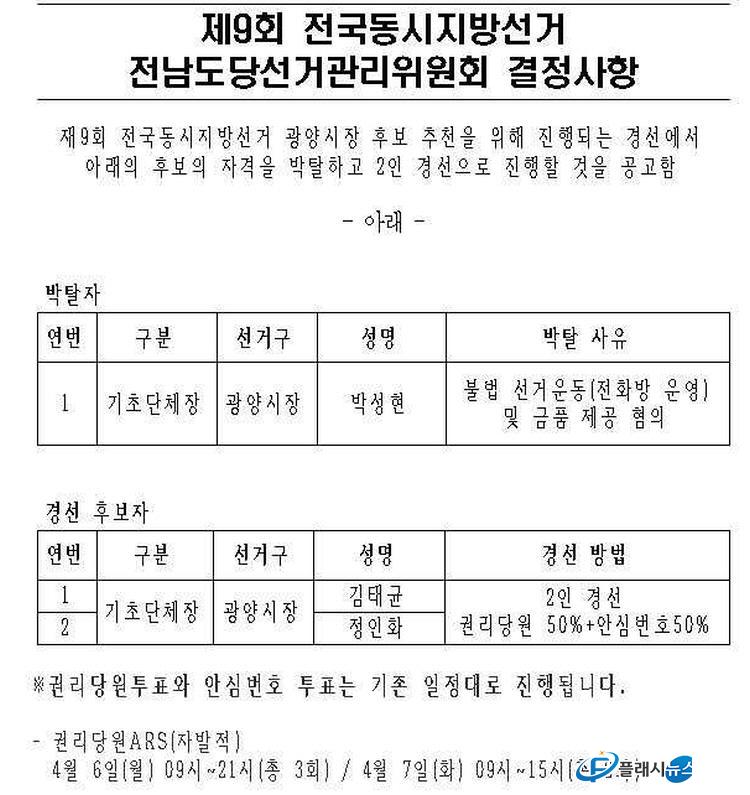 Àü³²µµ¼±°Å°ü¸®À§¿øÈ¸´Â ¾Õ¼ ¹Ú¼ºÇö Èĺ¸ÀÇ ÀÚ°Ý ¹ÚÅ»Àº ºÒ¹ý ¼±°Å¿îµ¿ ¹× ±Ýǰ Á¦°ø ÀÇȤÀÌ °áÁ¤Àû »çÀ¯·Î ÀÛ¿ëÇÑ °ÍÀ¸·Î ÀüÇØÁ³´Ù. ¾Õ¼ Àü³²µµ¼±°Å°ü¸®À§¿øÈ¸´Â °æ¼± °úÁ¤¿¡¼ ºÒ¹ý ÀüÈÈ«º¸ Á¶Á÷À» ¿î¿µÇÏ°í °æ¼±¿îµ¿¿ø¿¡°Ô ±ÝǰÀ» Á¦°øÇÏ·Á ÇÑ ÇøÀÇ·Î ¹Ú Èĺ¸¿Í °ü·ÃÀÚµéÀ» °æÂû¿¡ °í¹ßÇß´Ù.
